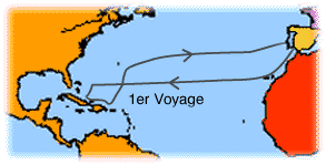 Colomb part donc avec trois navires et 90 membres d'équipage de Palos le 3 août 1492. Arrêt aux Canaris. et après une période de tension toujours de plus en plus vive entre Colomb et ses marins, le 10 Octobre, les premiers signes indirectes de terre se montrent. le 12, la terre est en vue. C'est une île, Guanahami (San Salvador). Les "indiens", puisque Colomb n'hésite pas à les appeler ainsi dans ses descriptions, lui assurent qu'il faut aller plus à l'ouest pour trouver de l'or. le 28 octobre, il est à Cuba. Colomb est persuadé d'avoir atteint le continent asiatique et de connaître sa position exacte sur le continent. La flotille se dirige alors vers l'est le long de la côte cubaine. Le capitaine de la Pinta déserte à la poursuite de l'or vers l'ouest. À Hispaniola, une grande île à l'est de Cuba, il trouve enfin de l'or en quantité. La santa-Maria s'échoue et devient inutilisable. Colomb laisse 39 hommes dans un fort et rentre au plus vite vers l'Espagne. Sur le chemin du retour, il croise la Pinta. Le retour est difficile.
